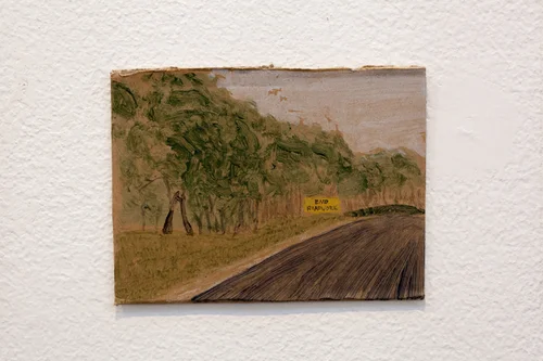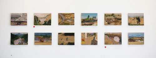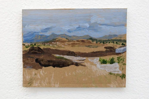 Annika Harding, Ida, Richie and Ellis walking ‘Up and Under (Yltä ja Alta)’ by Nancy Holt, 15 January 2016, 2019, acrylic on board, 20 x 25cm each